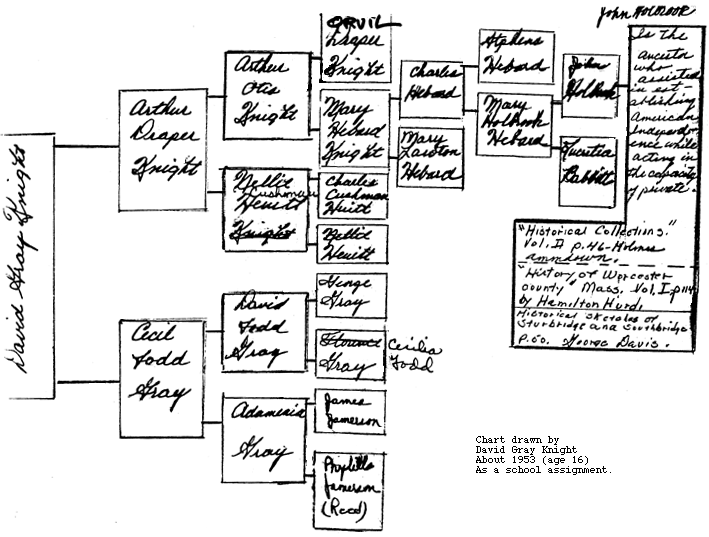 I was unable to see both of my grandmothers so the information I received was from my parents and what they could remember. When I was home I did turn up some recorded writing on some of my ancestors which helped me to establish a few minor facts. For instance, both the men and women on my father's side of the family were very tall. There was one Great Grandfather who was 6'4" and was noted in and around Worcester for his strength. I also traced my family far back to the Revolutionary war to John Holbrook, the owner of the first grist mill at the famous Sturbridge Village. He also was a man connected with the war its self. Some of the characteristics which I have inherited are as follows. I have straight, fine, dry hair which is found on my mother's side of my family. I also have the small body which was predominate in my mother's family. I will probably be loosing my hair at the age of 23. My father says it is a receding hair line but it doesn't look that way to me. My mother and father are people of two kinds. I am a little procrastinater just like Dad and also a muscian like my Mother. But mother does not coordinate very well and Dad does. I followed Dad here for I have little trouble in developing a new way to work my body in athletics. I am far sighted and so is my father and his father was too. I don't know if this is coincidental or not but all the families on both sides have 3 children for the exception of my Dad's parents and their family. This includes my two sisters whom each have 3 children. I wonder if I will only be able to produce just 3. Who knows? On my mother's side there have been many good mathematitions. On Dad's side there are none. It seems that I have quite a lot of trouble with my numbers also. There have been a few artists in the family and I have acquired a little bit of that ability. Going back to my body structure, I have weak ankles and always having trouble with my spraning them. My mother also has weak ankles but whether or not that is the sourse which I received mine I am not to sure. There have been few diseases in the family. One in particular is diabetes. My sister has had it since the early age of 14 and she is now 34. She will have to take insulin all her life. I can't seem to find any trace of any one having it in my ancestors. May be they had it but didn't know what was wrong, and died. My mother had Rumattic feaver when she was a little girl and has had a weak heart ever since. She has an uncommon blood Type O Rh negative. I have two sisters. One is 34, the other is 31. There is quite a distance between them and myself so I have more or less grown up to be the only child. They are both very strong for girls and are very athletic. My oldest sister looks like my mother and my youngest sister, as I call her, has my father's features. The avererage life span in our family is about 85, quite an old age. This is my family tree and I am proud of it. I plan to go back further, as far back as was recorded if possible. I do know that there was a Presbyterian Minister in Scotland. I would like to find more about him. All in All I have enjoyed doing this work on heredity, and would like to do more. [Teacher's note: Interesting account. So your sisters belong to DAR? Probably they could because descended from John Holbrook. Grade: A.] David Gray KnightEyes